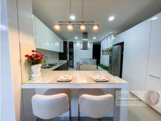 Características principales: ascensor con ingreso directo al apartamento, hall de entrada, sala y comedor en concepto abierto, cocina moderna con isla, hall de TV, zona de ropas independiente y depósito.